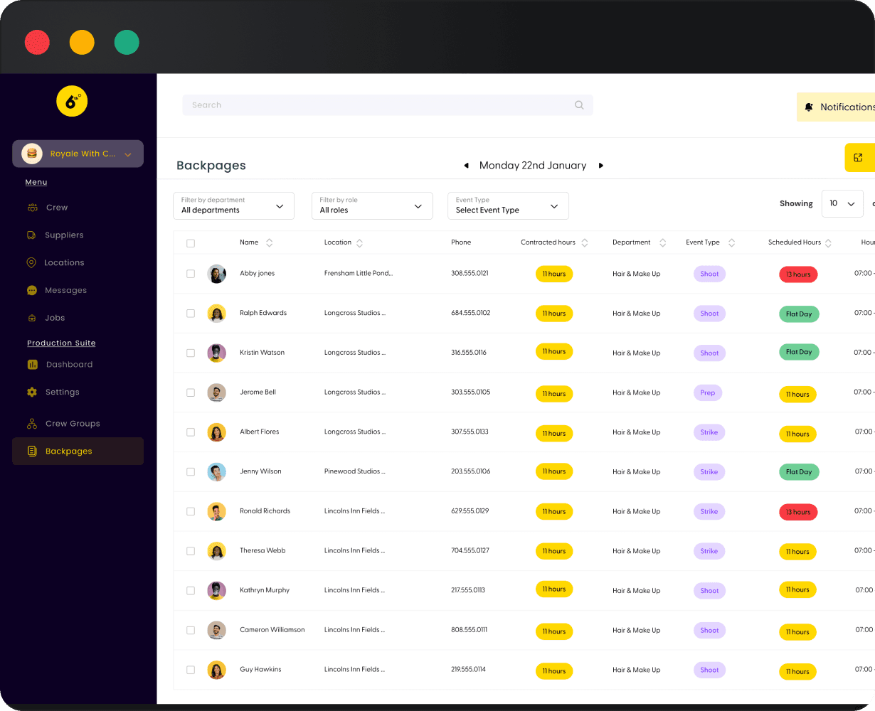 With the schedule information, Sixth Degree automatically generates your backpages. Export them to attach to your call sheet, filter by event type, and catch any pre-calls or overtime before they occur.