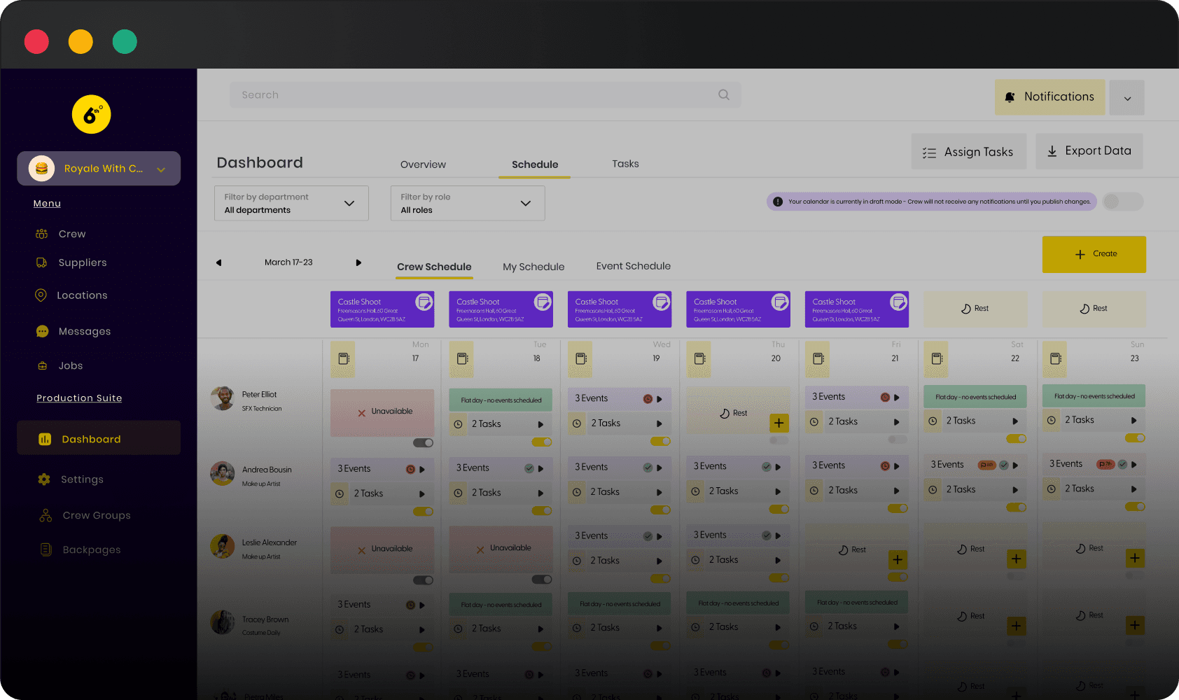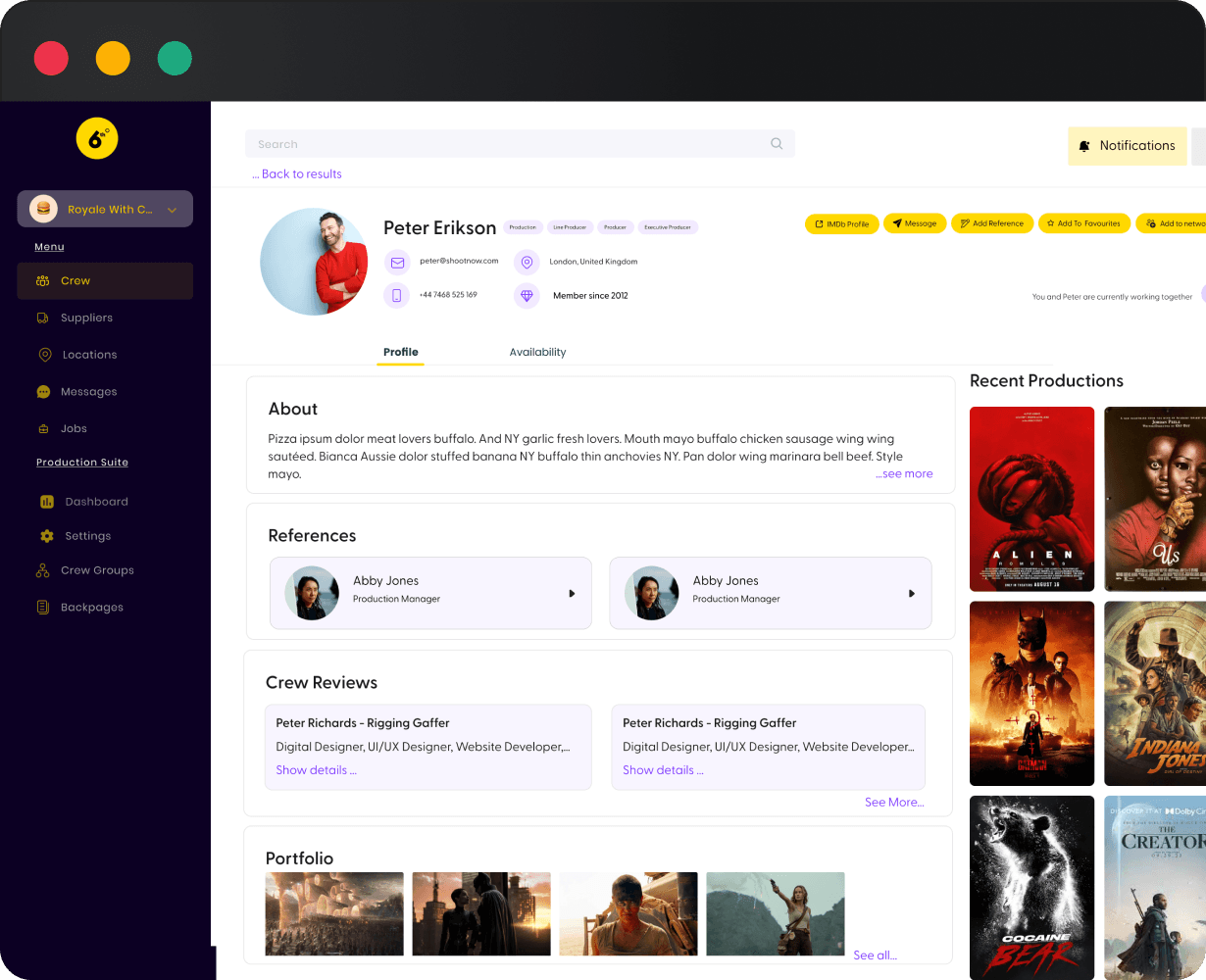 Manage your production crew seamlessly from our central dashboard. Find and reach out to crew, offer them jobs, and more. Ideal for busy times, large-scale shoots requiring numerous dailies, or filming in remote locations where local crew is needed. Our central database shows crew availability, including their current engagements and blocked days.